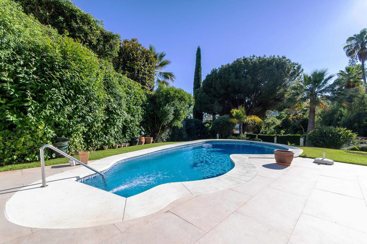 The house has two separate entrances, two covered parking spaces with a pergola, and a garage for one car