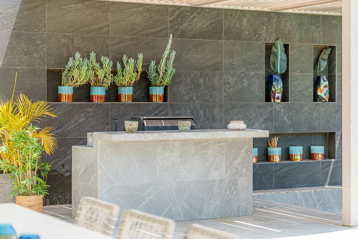 Ascending to the main floor, you will find a designer open-plan kitchen equipped with top-of-the-line Gaggenau appliances. The living room extends onto an outdoor terrace, creating an idyllic indoor and outdoor living experience. Here, you can enjoy a refreshing swim in the pool, prepare meals in the outdoor kitchen, or relax in the chill-out area next to the fireplace.