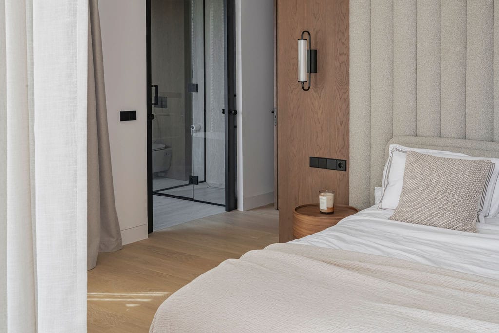 The upper floor is dedicated to the private living quarters, comprising four en-suite bedrooms. The master suite stands out with its private terrace and luxurious bathroom, creating a comfortable and private retreat. Several bedrooms enjoy access to terraces that enhance the indoor–outdoor lifestyle and provide pleasant open views.