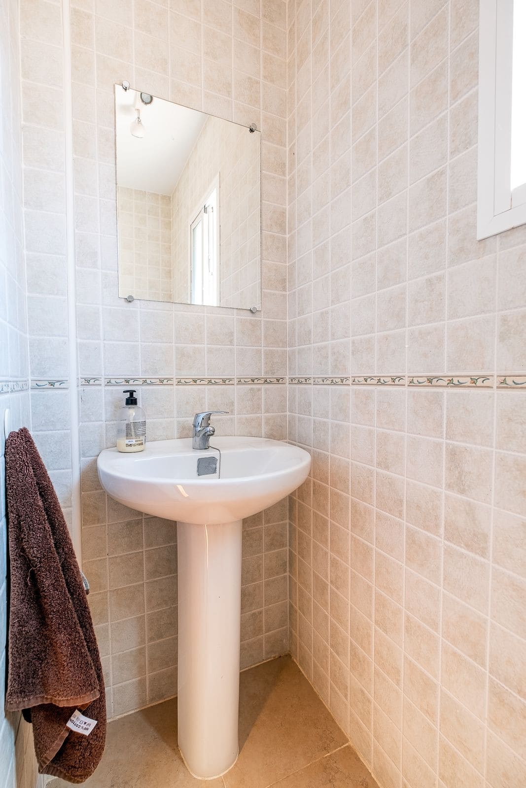First floor: Bright and airy open-plan living and dining area, modern kitchen, and a partially covered terrace perfect for relaxing, dining, or entertaining. Includes a guest bedroom with private courtyard.