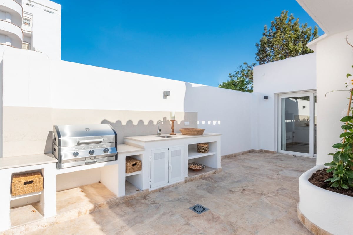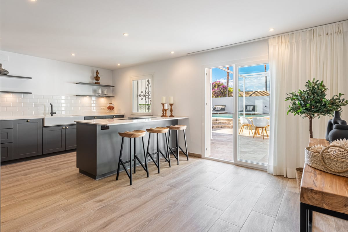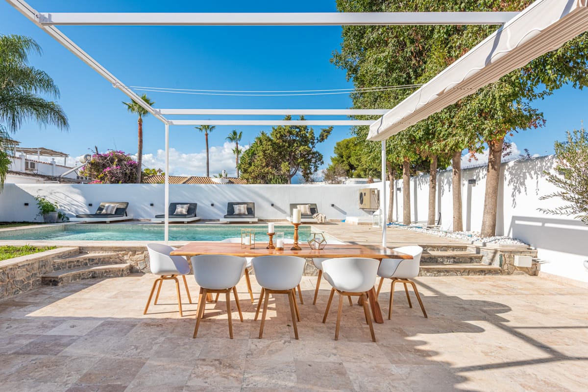 Elegant View Residence in La Cerquilla, Nueva Andalucía Located in the prestigious and secure gated community of Aldea Dorada, this semi-detached residence offers the ease of a townhouse with the elevated presence of a penthouse, set in one of Nueva Andalucía’s most exclusive and tranquil locations. From its privileged position, the property enjoys exceptional panoramic views across the Mediterranean Sea, the Golf Valley, and the iconic La Concha Mountain—widely considered among the finest views in Nueva Andalucía and the defining feature of the home. Behind a classic Andalusian façade, the interior reveals a warm and refined Japandi-style renovation, featuring high ceilings, open-plan living spaces, and modern bathrooms that create a calm and elegant atmosphere. The entrance level offers an open living and dining area with a striking suspended fireplace, a discreet office space, and direct access to a partly covered terrace designed to fully embrace the views. The home offers 300 m² built, 76 m² of terraces, and a 300 m² private garden with avocado, mango, and passion fruit trees. A plunge pool on the upper terrace delivers a true penthouse-style outdoor experience. The property comprises four bedrooms and three bathrooms, with excellent potential to create a luxurious master suite with walk-in wardrobe and en-suite bathroom. Additional features include a private gym, two large storage rooms, covered parking for two cars, and lower-level terraces with direct access to the garden. A rare opportunity for buyers seeking a secure, semi-detached luxury home with breathtaking views and effortless maintenance.