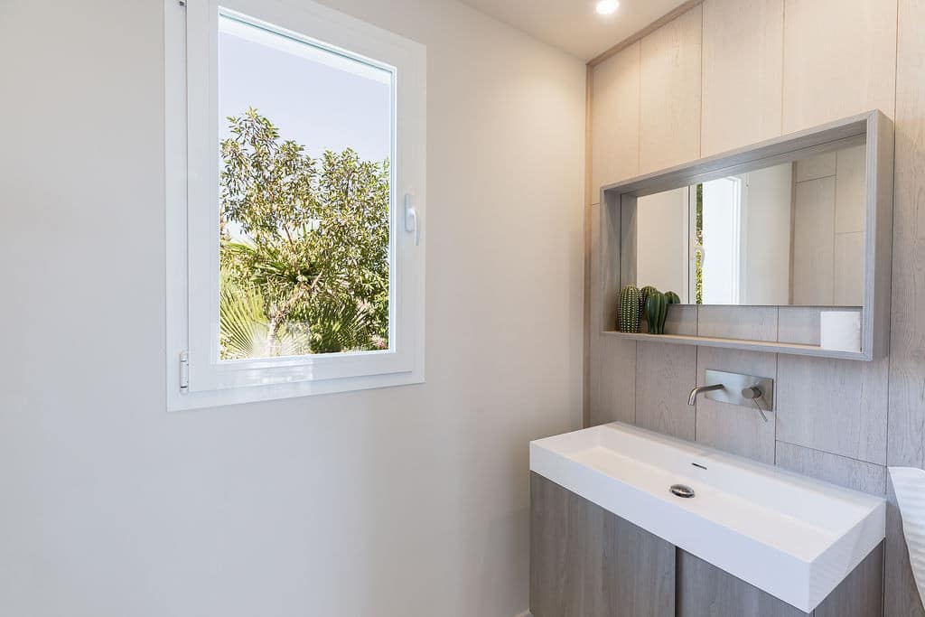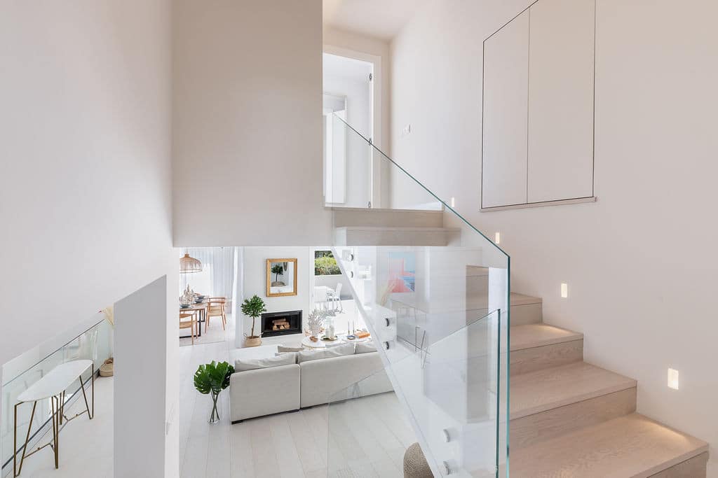 The lower level offers three generous double bedrooms, each with fitted wardrobes and direct access to a tranquil private sun terrace. The master bedroom features a stylish en-suite bathroom, while a second contemporary bathroom serves the remaining bedrooms—perfect for family or guests.