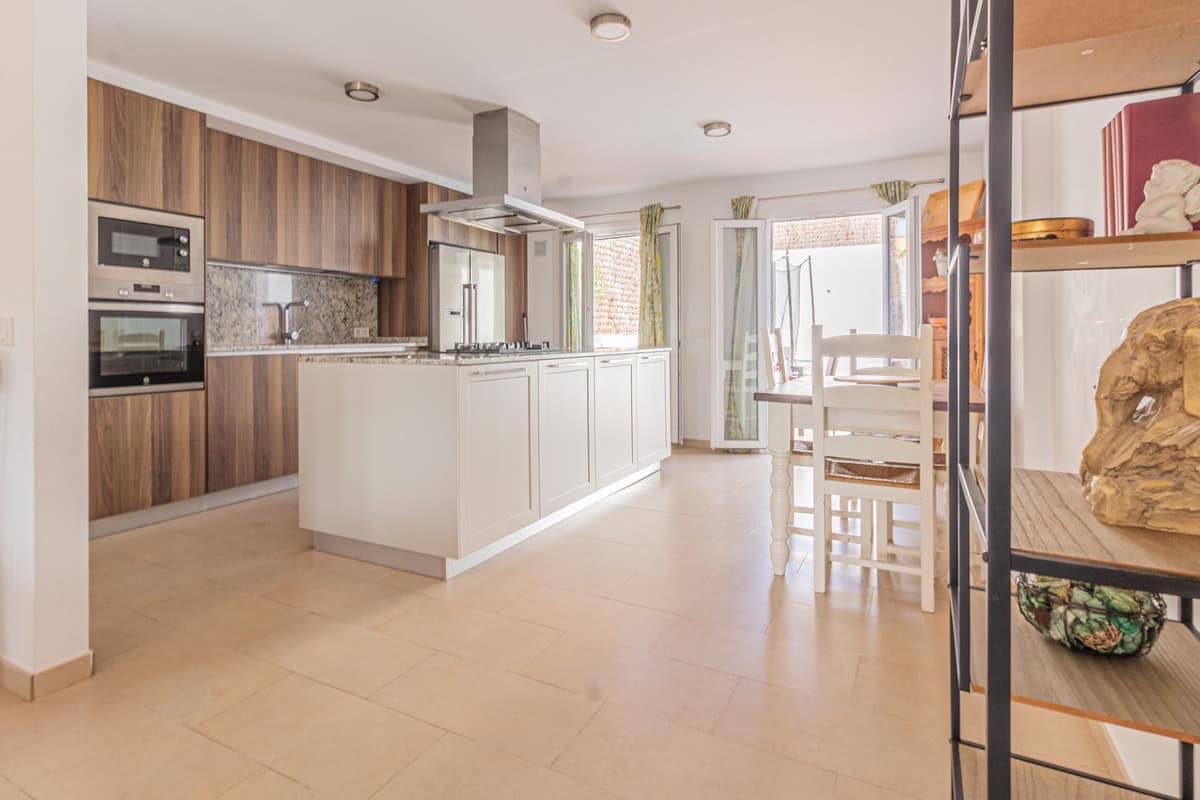 Inside, the villa has been renovated in a modern and elegant style, using high-quality materials. Natural light floods every corner thanks to its premium PVC windows. The fully equipped kitchen features a central island with gas burners and integrates seamlessly with the open-plan living room, which includes a cozy fireplace, ideal for winter evenings.
