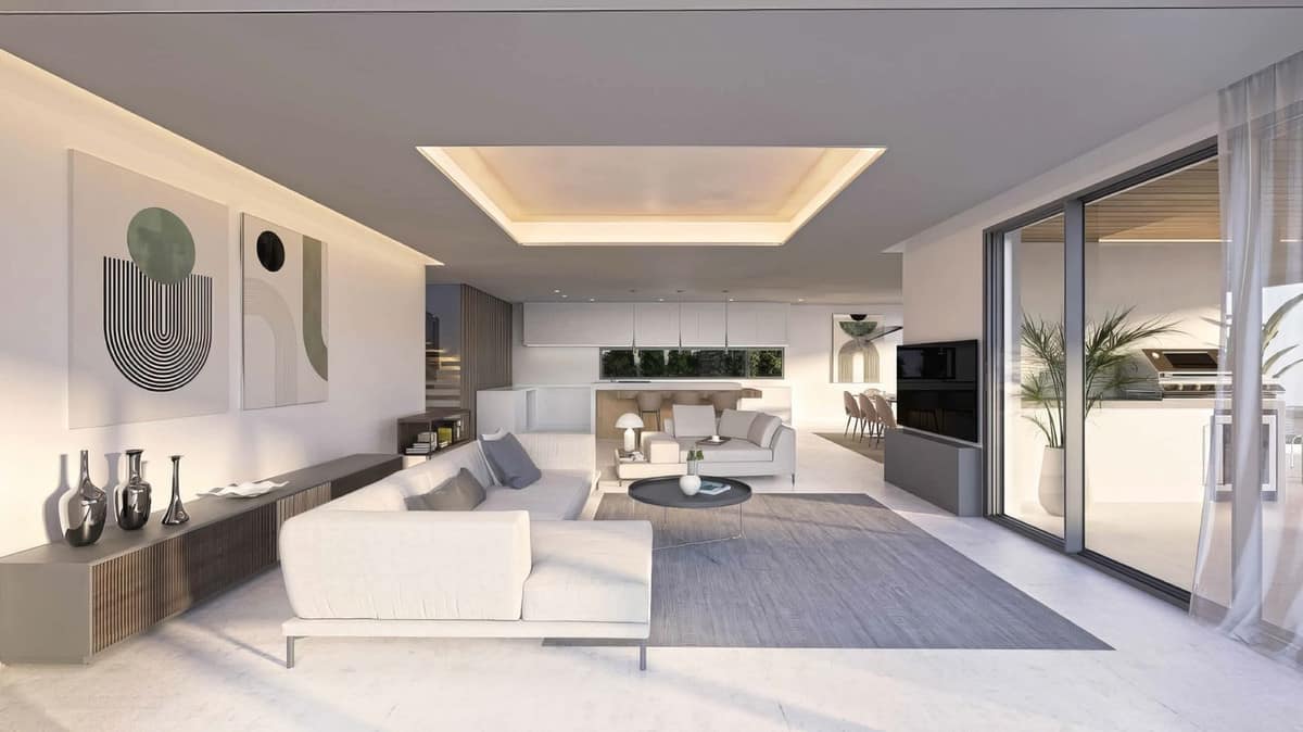 Upstairs, accessed via an elegant staircase with a glass railing, is the impressive 45 m² master suite, featuring a private terrace, walk-in closet, and en-suite bathroom.