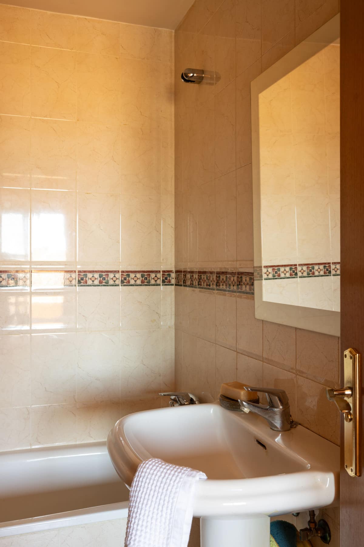 The entrance porch to the house, measuring 24.96 m², serves as an uncovered parking space. From here, you access the upper floor of 55.96 m², which consists of three bedrooms, two bathrooms, a rear terrace, and stairs leading to the lower levels and upper attic.