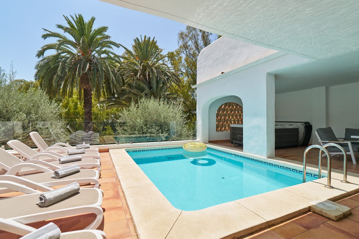 = Jacuzzi, outdoor shower, and covered outdoor kitchen