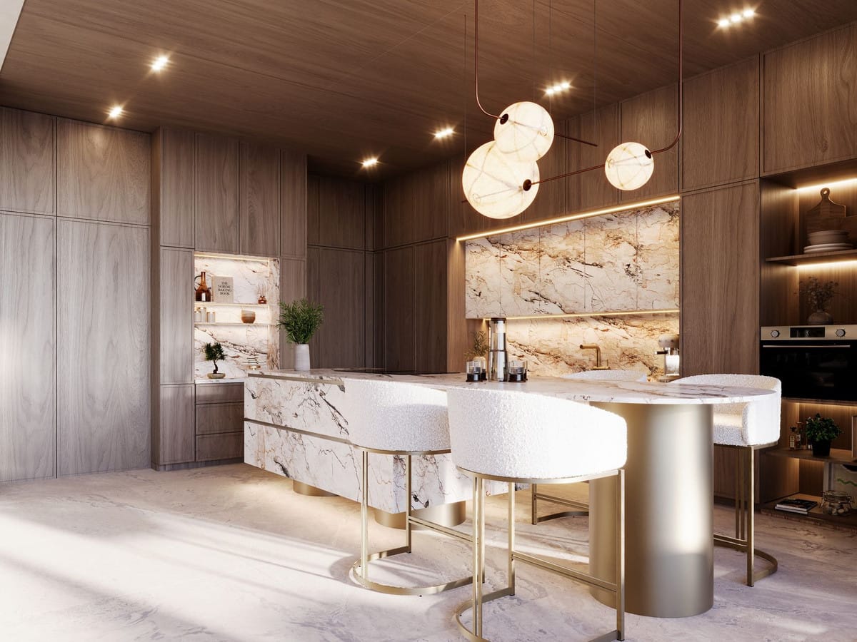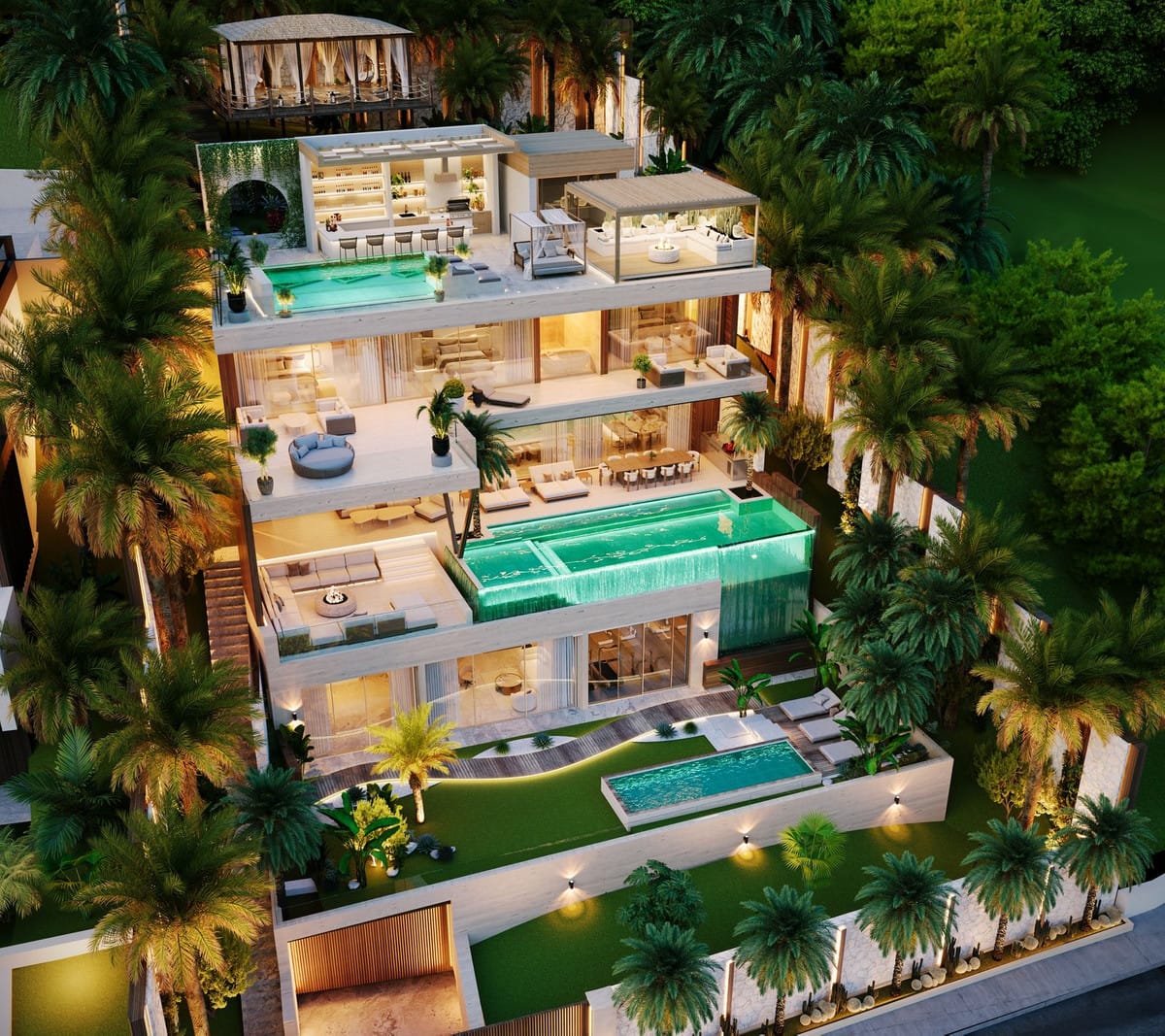 Sleeping area featuring several en-suite bedrooms with private walk-in closets, luxury bathrooms, and terraces with panoramic views.