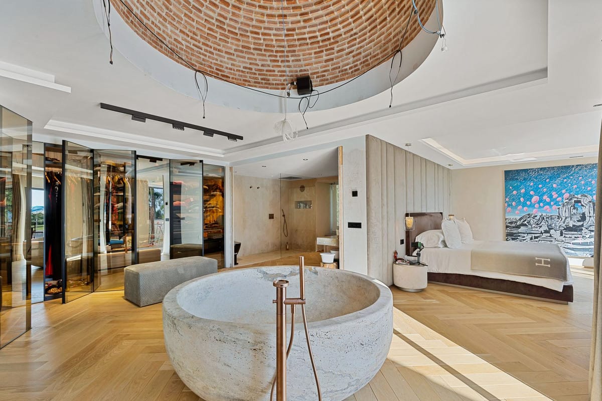 The main entrance with large vestibule, guest bathroom and lift, leads to the large open plan living and dining area with designer kitchen by Siematic including Gaggenau appliances. There is also service access to the kitchen from the car port at the street entrance to the villa. In the living area, silent electric pocket windows disappear neatly into the stone cladded walls to take us to the generous floating terrace where we can embrace the magnificent view of the Mediterranean and the Golf Course. This level of the villa is also home to the luxurious principal bedroom with private terrace, en suite bathroom and private dressing room.
