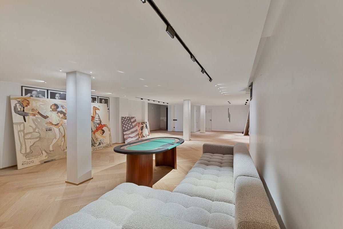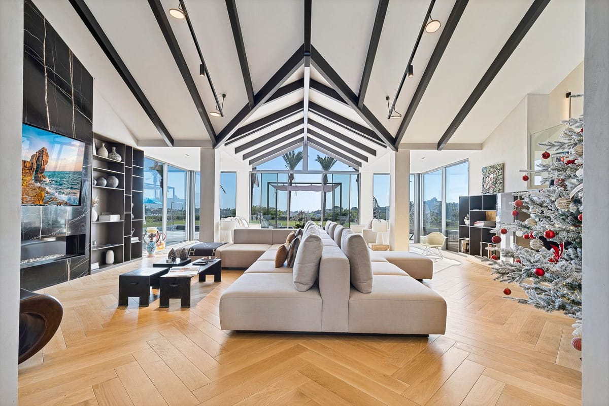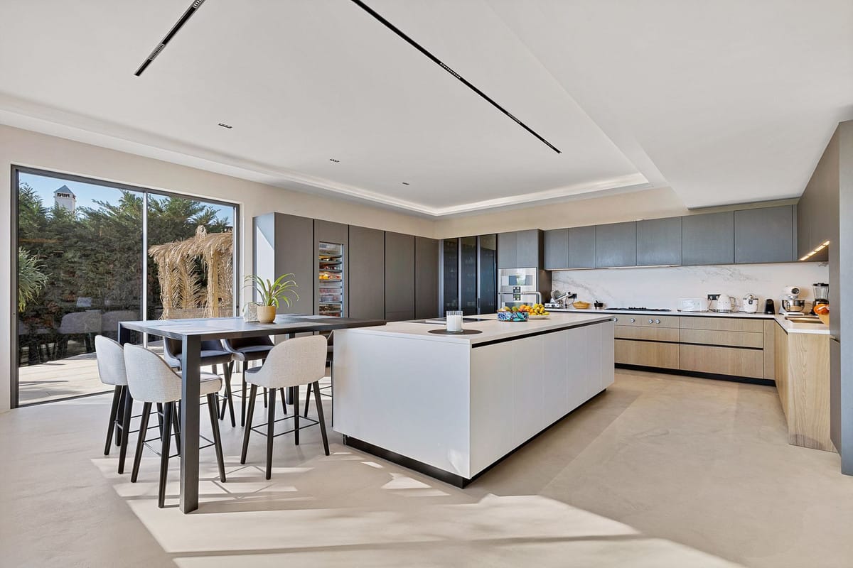 From the main vestibule, we descend one level where there are 4 large bedrooms with en suite bathrooms and all with direct access to the luscious gardens and swimming pool beyond. On this level, there is also a full gymnasium and Sauna, bodega and in house cinema, with hospitality kitchen by Siematic, and games area. The closed garage comfortably accommodates 4 cars and there is also a separate laundry room. The adjacent landscaped gardens are carefully manicured and surround the infinity pool with outdoor kitchen and BBQ by Siematic with seated area. For cooler evenings guests can also enjoy a second fire pit area in the garden.