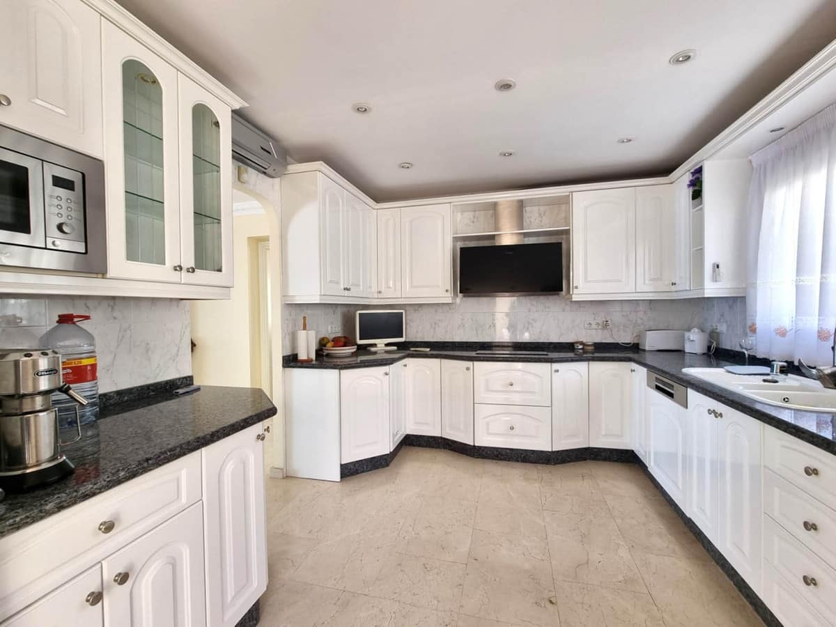 Set on an 889 m² plot surrounded by lush gardens and mature trees, the outdoor spaces are just as impressive. A large heated saltwater pool becomes your private oasis, framed by sun loungers and beautifully landscaped greenery. A shaded lounge area provides the perfect setting for entertaining or relaxing under the Mediterranean sun.