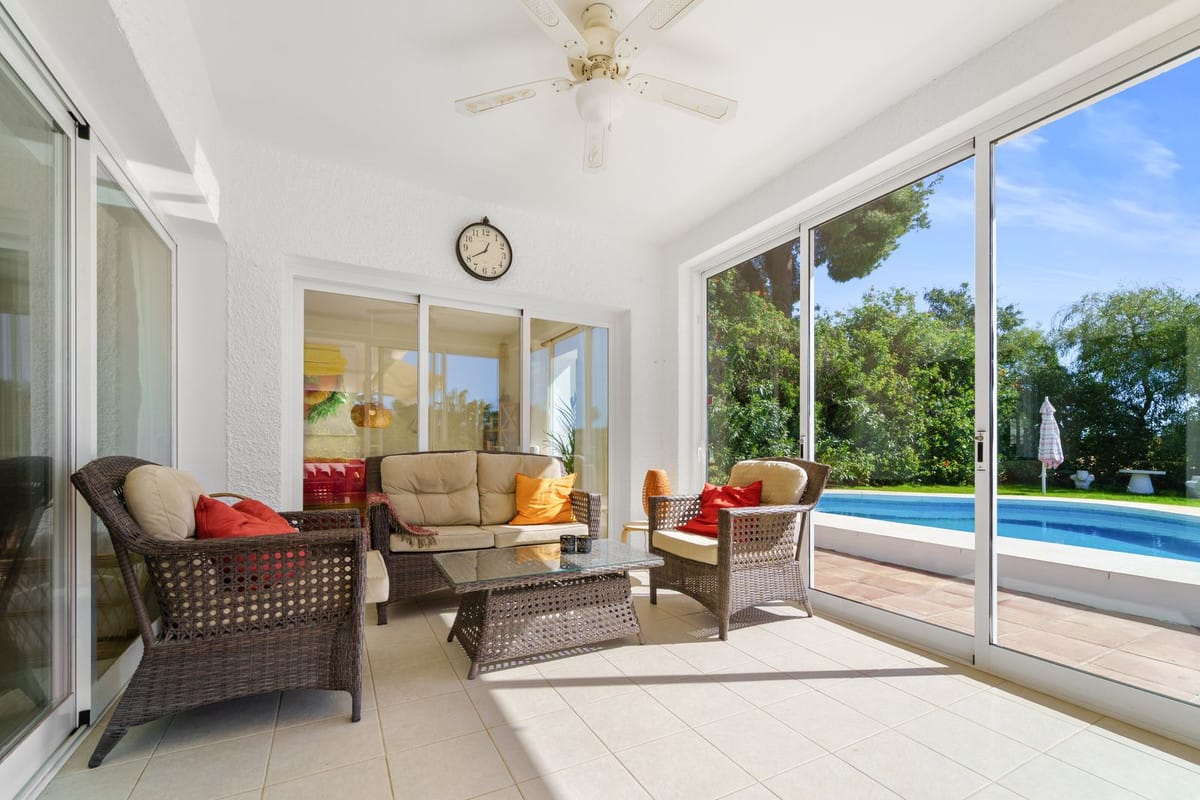 The well-maintained garden is a private oasis with an inviting pool area, outdoor shower, and several spaces for relaxing in the sun. The property also includes a garage and offers a comfortable and exclusive lifestyle in one of the most sought-after locations in the area.