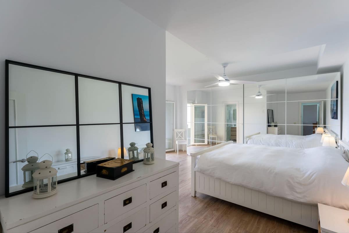 On the lower level, the property boasts a superb master suite complete with en-suite bathroom and patio doors opening directly onto the pool area. This floor also offers a second expansive living and dining space, enhanced by a striking floor-to-ceiling glass feature gas fireplace, creating a stylish division between areas while adding warmth and character. From here, floor to ceiling patios doors lead out to a covered terrace overlooking the private pool and enjoying far-reaching views towards Álora.
