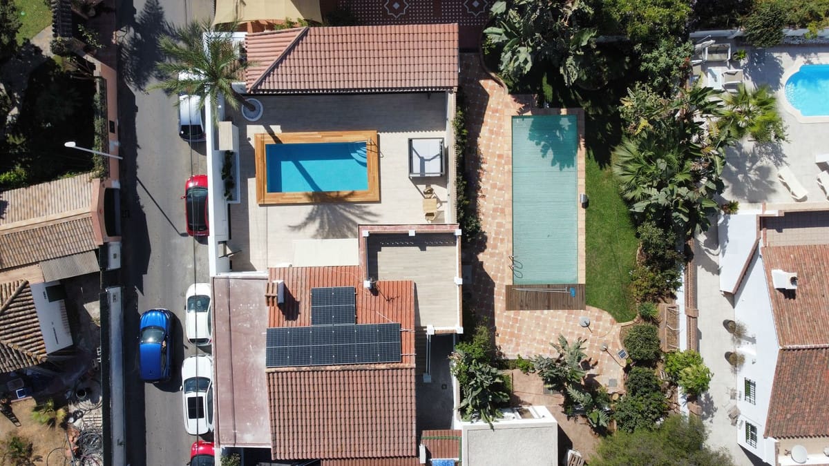 It offers 3 bedrooms, 2 bathrooms, a spacious living-dining room with TV area, and a modern fully equipped kitchen with Siemens appliances. The entire house benefits from underfloor heating, air conditioning, and state-of-the-art solar panels capable of generating enough energy to run the property without external electricity consumption.