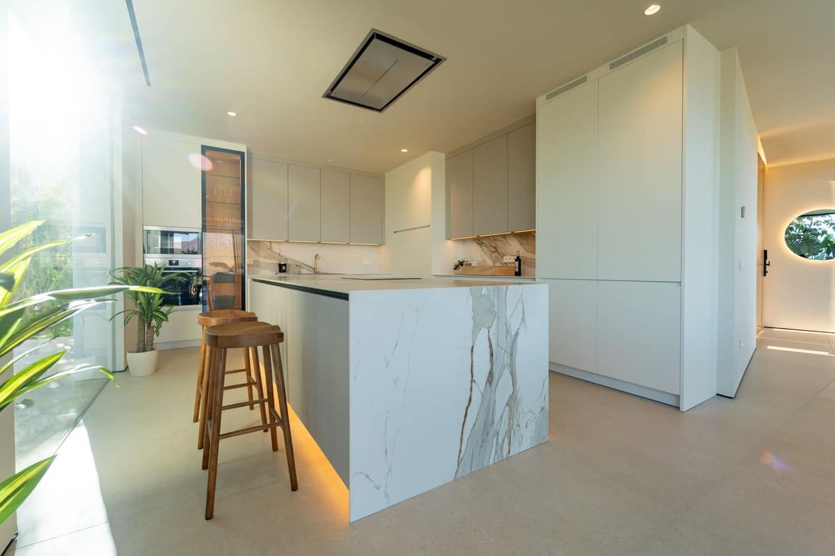 The first floor hosts a spectacular master bedroom with two walk-in wardrobes and a luxurious en-suite bathroom. There is also a second en-suite bedroom. An exterior staircase takes you up to the dream-like solarium, featuring a jacuzzi and outdoor lounge area, where you can soak up the sun all day and admire jaw-dropping views.