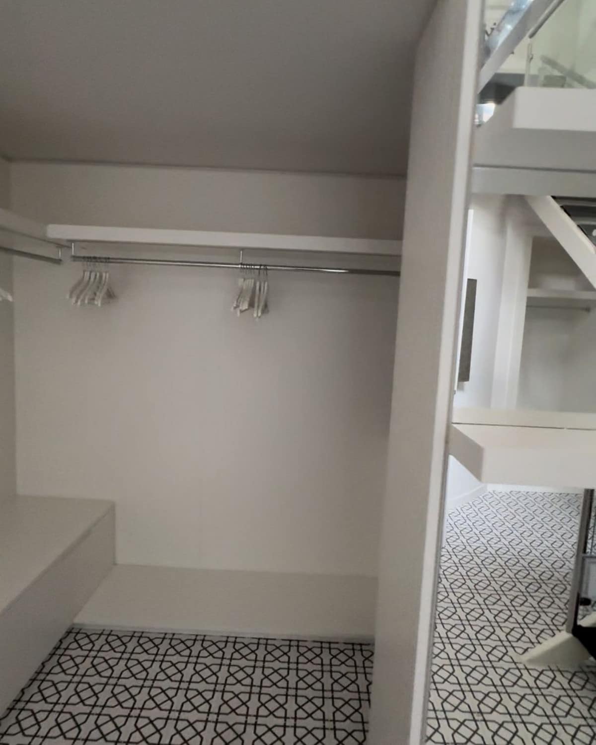 To the left of the elevator, you enter the second bedroom (BR2), designed in a unique layout featuring an elegant king-size bed, a separate shower and toilet, and an adjacent sink area, all adorned with beautiful silk curtains.