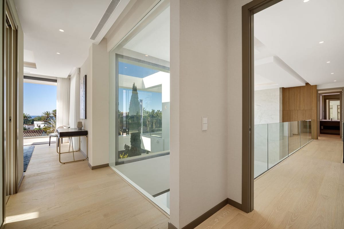 There is one large guest bedroom with en suite bathroom as well as a powder room on the same floor. The wide floating gallery staircase takes us to the first floor, where we find two fabulous bedrooms with en suite bathrooms and access to their own private terraces. One of the bedrooms belongs to the Master Bedroom suite with a spacious dressing room, full bathroom with a bathtub, walk-in shower and double sink. Both bedrooms enjoy lovely sea view from this level, which also leads us to an outside staircase up towards a 100m2 solarium on the top of the villa. Here we have amazing sea views and plenty of space for a chill out, jacuzzi, outdoor gym, a BBQ area, etc..