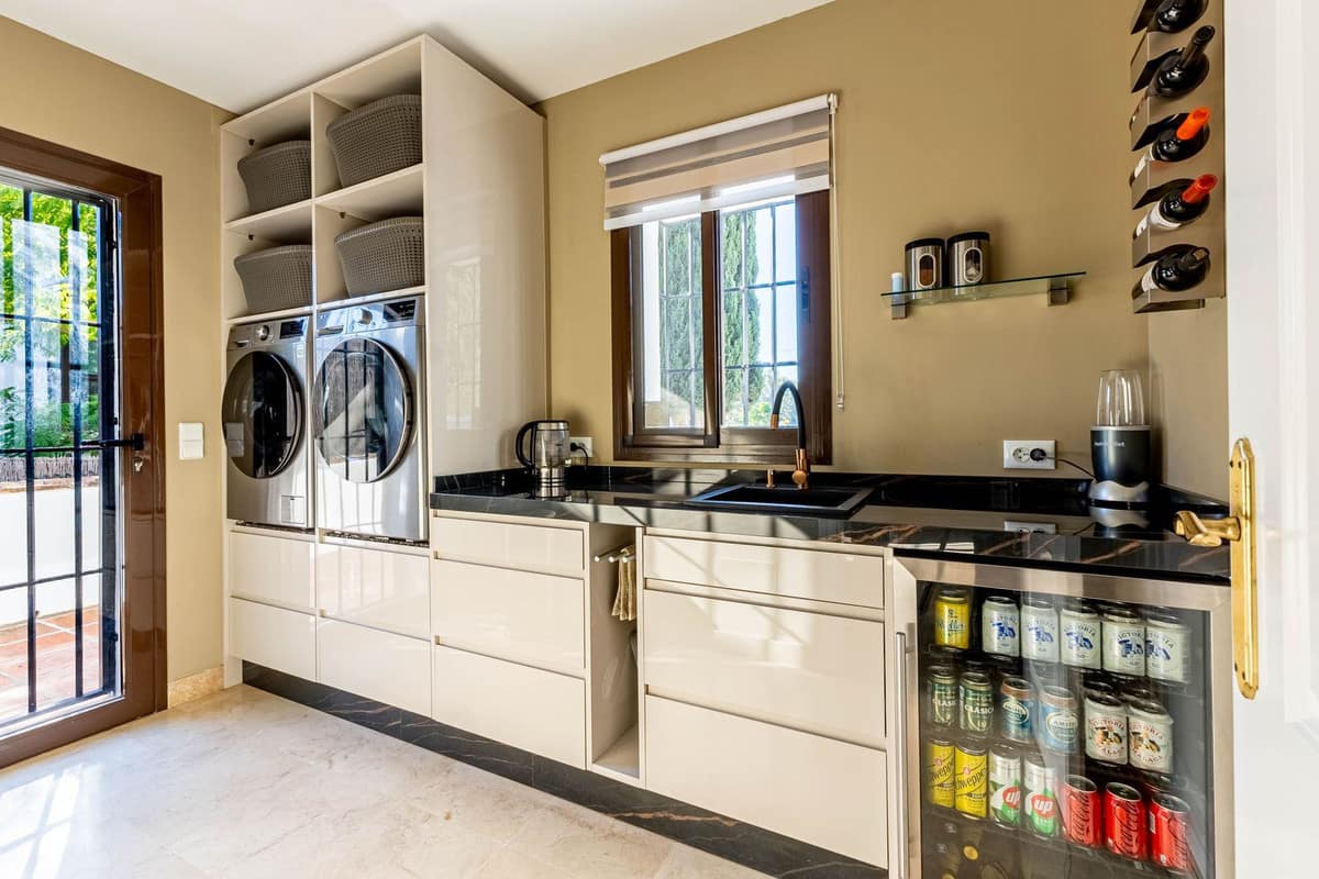 The newly renovated kitchen is fitted with premium Smeg appliances, multiple coolers, a wine fridge, and a separate utility room equipped with brand-new washing machines and dryer. The utility room opens onto its own private terrace.