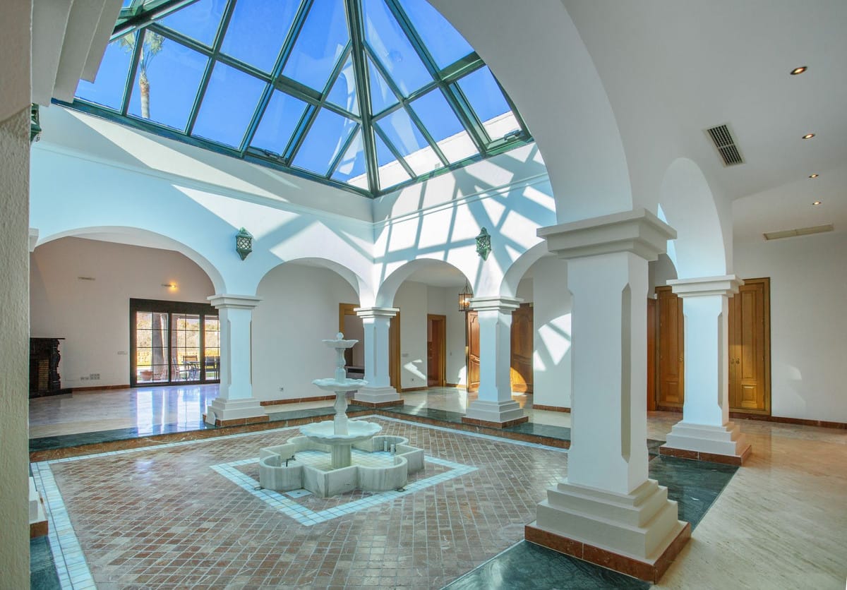 The property combines the charm of traditional Andalusian architecture with modern amenities. Its most distinctive feature is a central glass-enclosed atrium with a fountain, which floods the house with natural light and creates a pleasant sense of spaciousness throughout. High ceilings and marble floors, which extend onto the outdoor terraces, reinforce the seamless flow between indoors and outdoors.
