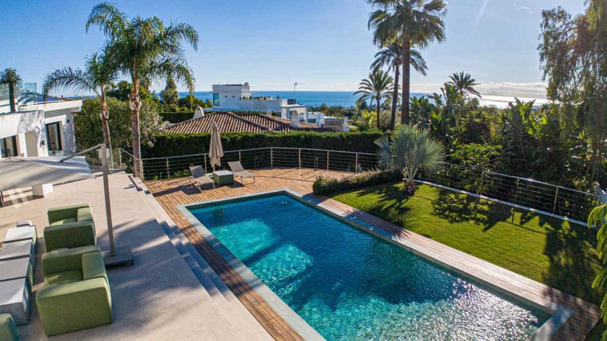 Villa Royale is a five-bedroom luxury home in the prestigious Nagüeles area. The property offers panoramic sea views, elegant open-plan living and a seamless flow between indoor and outdoor spaces. Every room opens to terraces and gardens that surround a heated pool, creating a calm and private retreat for modern living.