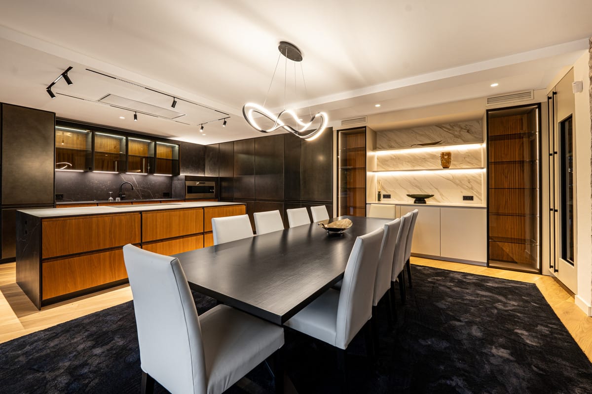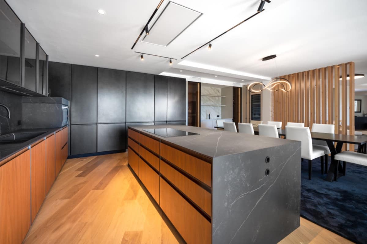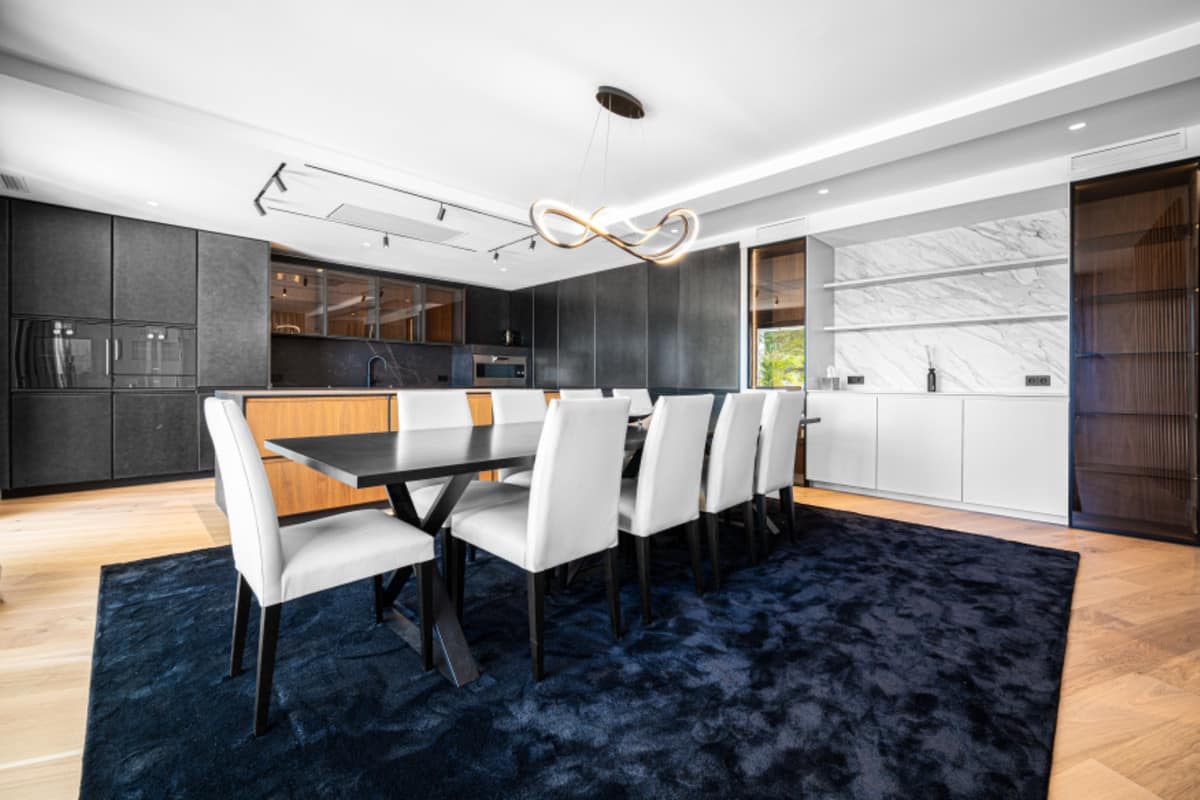 The main level includes a bright living area with a stone-feature wall and a statement fireplace. The dining room seats ten and connects to a designer kitchen finished in black and wood, complete with hidden appliances and a second concealed kitchen. Three bedrooms with en-suite bathrooms also sit on this level, each opening to the terrace and landscaped gardens.