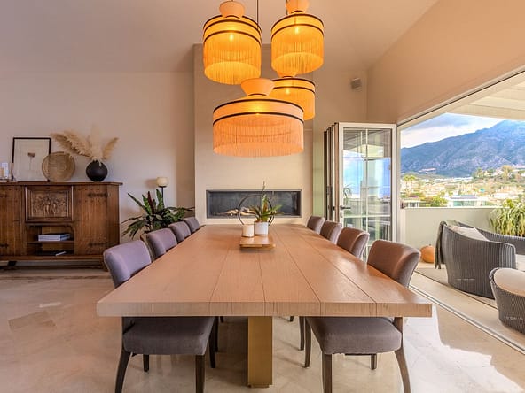 The villa is fully furnished and features a large living room with a fireplace, creating a warm and comfortable atmosphere. Large sliding doors open onto a private covered terrace with views of the mountains and landscaped garden, offering a perfect space for relaxing or dining outdoors.
