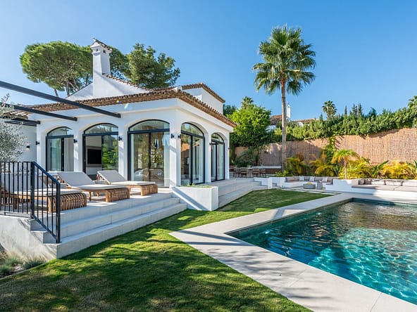 This Andalusian-style villa is located in a quiet and green area of Nueva Andalucía, next to Puerto Banús. Built on a 1,204 m² plot with a total living space of 506 m², the property offers 5 spacious bedrooms, 6 bathrooms, and 2 independent staff rooms, making it suitable for both family living and accommodating guests or household staff.