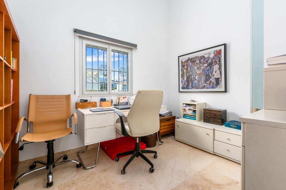 The house offers well-balanced family accommodation with a practical layout over two levels. Upstairs, there is a main bedroom with its own private terrace, together with two further bedrooms and a family bathroom. Downstairs, there are two additional bedrooms, one bathroom, a guest loo and an office.