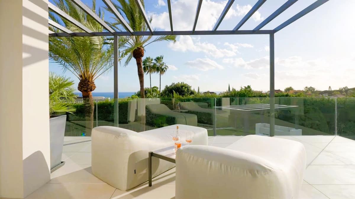 Terrace living area with luxury glass balustrade and metal pergola covering the entire area.