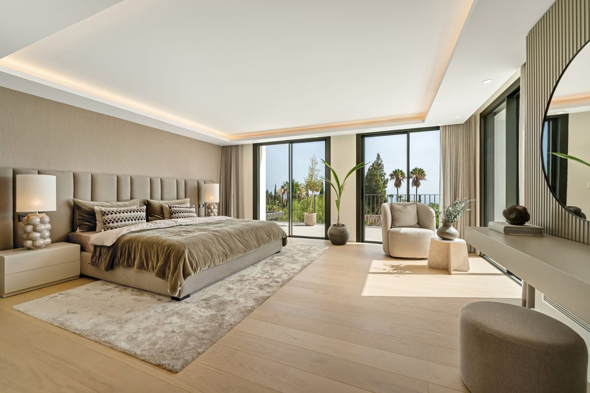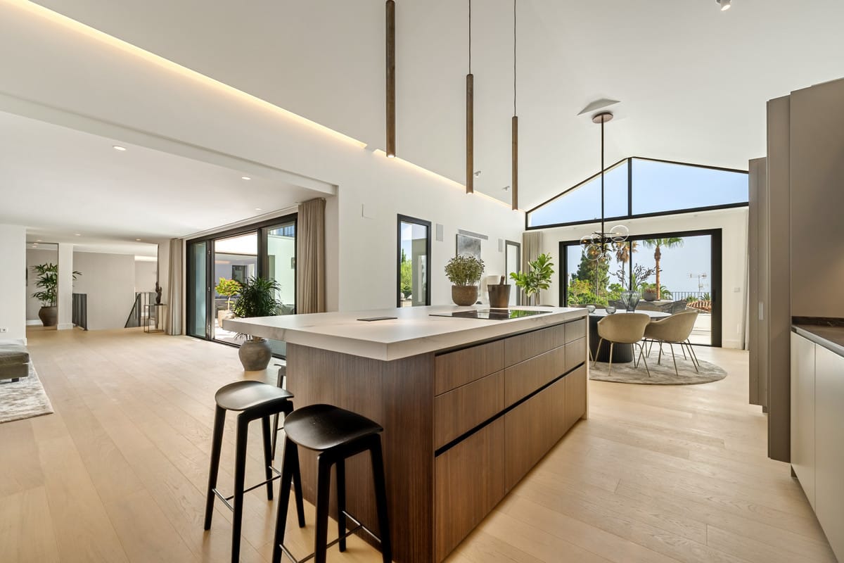Villa Rocío is a fully renovated Andalusian-style residence located in Rocío de Nagüeles on Marbella’s prestigious Golden Mile. Set on a 1,965m² south-facing plot beneath La Concha, the property enjoys open views of the Mediterranean. Modernised in 2025, the villa spans 734m² of light-filled interiors, where full-height glazing, vaulted ceilings, and seamless indoor-outdoor transitions frame the scenic surroundings.