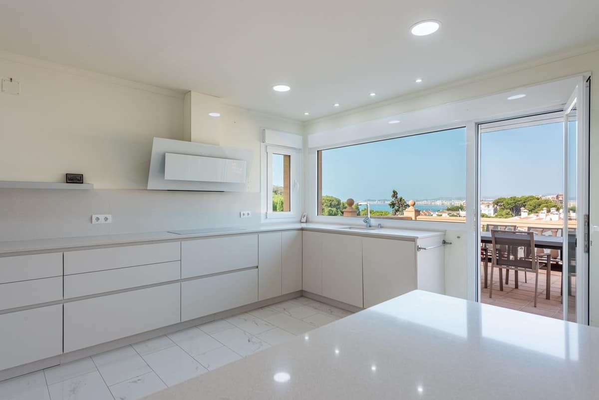 The villa features five well-proportioned bedrooms and three modern bathrooms, thoughtfully distributed across a light-filled layout. The open-plan living and dining area flows seamlessly into a fully equipped, contemporary kitchen, all oriented to capture panoramic views of the Mediterranean Sea.