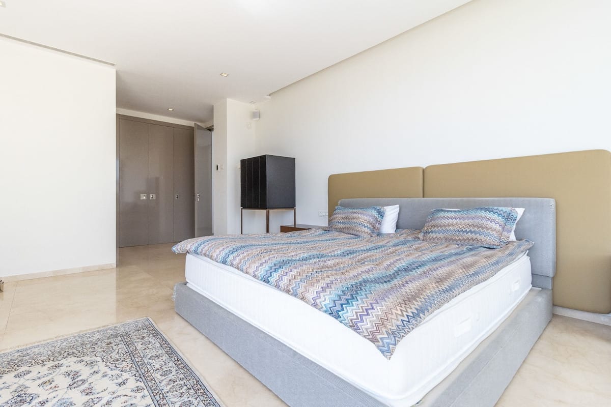 Upon entering the property on the first floor, you are captivated by the breathtaking panoramic views and the expansive glass facades of the villa. This level boasts a fully fitted kitchen with top quality appliances, a spacious living and dining area enjoying the views, and several bedrooms. The property also includes a private lift for easy access to all floors. On the lower floor, garden level, there is another open plan kitchen with large breakfast bar, leading into the living area that continues onto the terraces and gardens, plus additional bedrooms. The top floor boasts the master bedroom suite plus another guest bedroom, a solarium terrace, perfect for enjoying the stunning views.