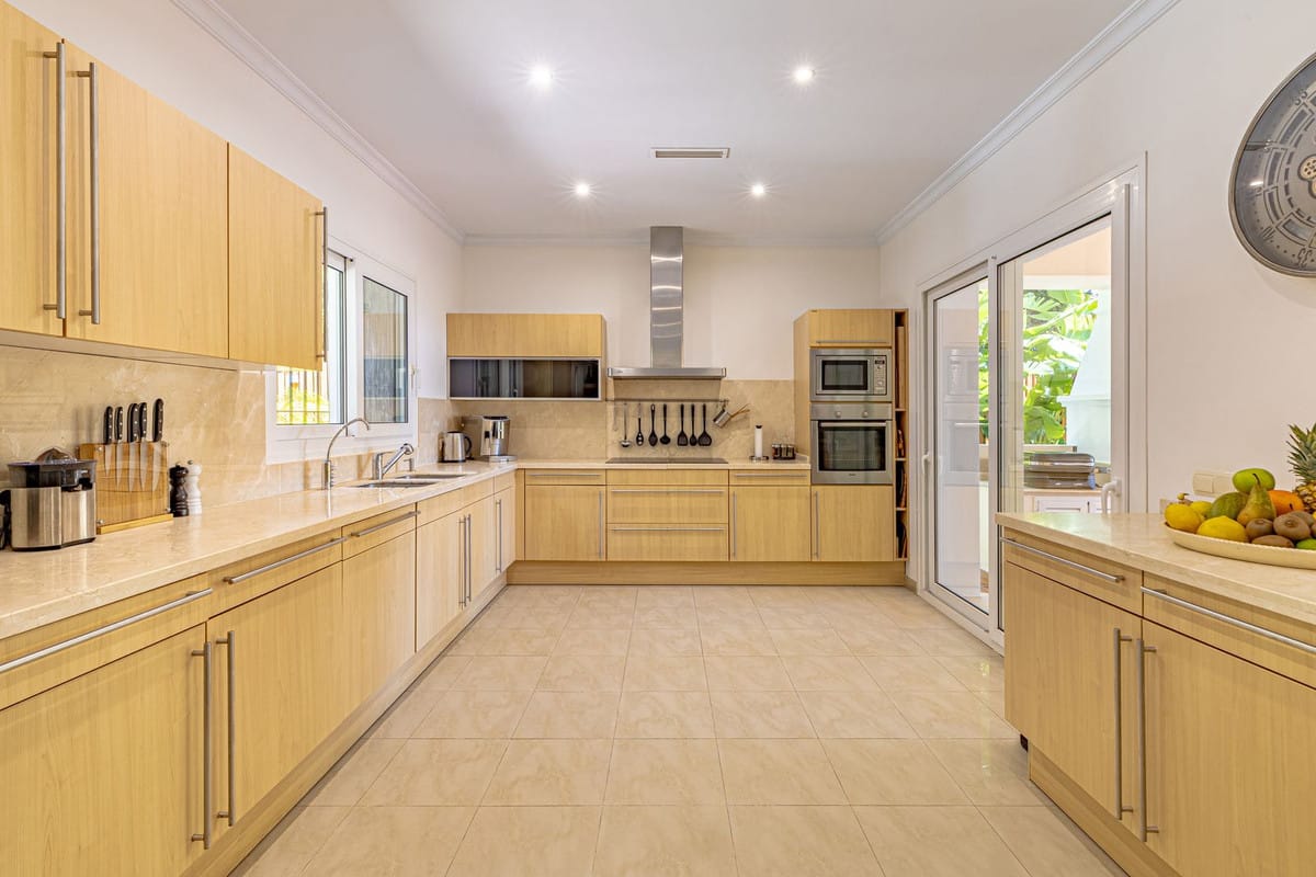 Spanning two levels, the villa features five spacious bedrooms, plus a self-contained quest apartment with a private kitchen, living room, bathroom, and an additional bedroom. The open-plan layout maximizes natural light, with floor-to-ceiling windows that seamlessly connect the elegant interiors to the breathtaking outdoors.