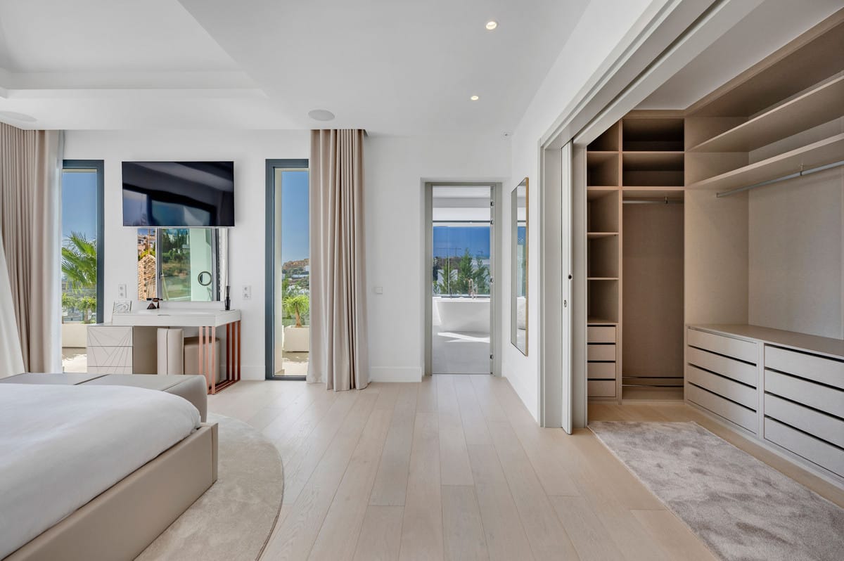 A private driveway leads to the top-floor entrance, where sweeping views of the Mediterranean and La Resina Golf Course immediately set the tone. Clean architectural lines, abundant natural light, and striking geometry create a stunning first impression.