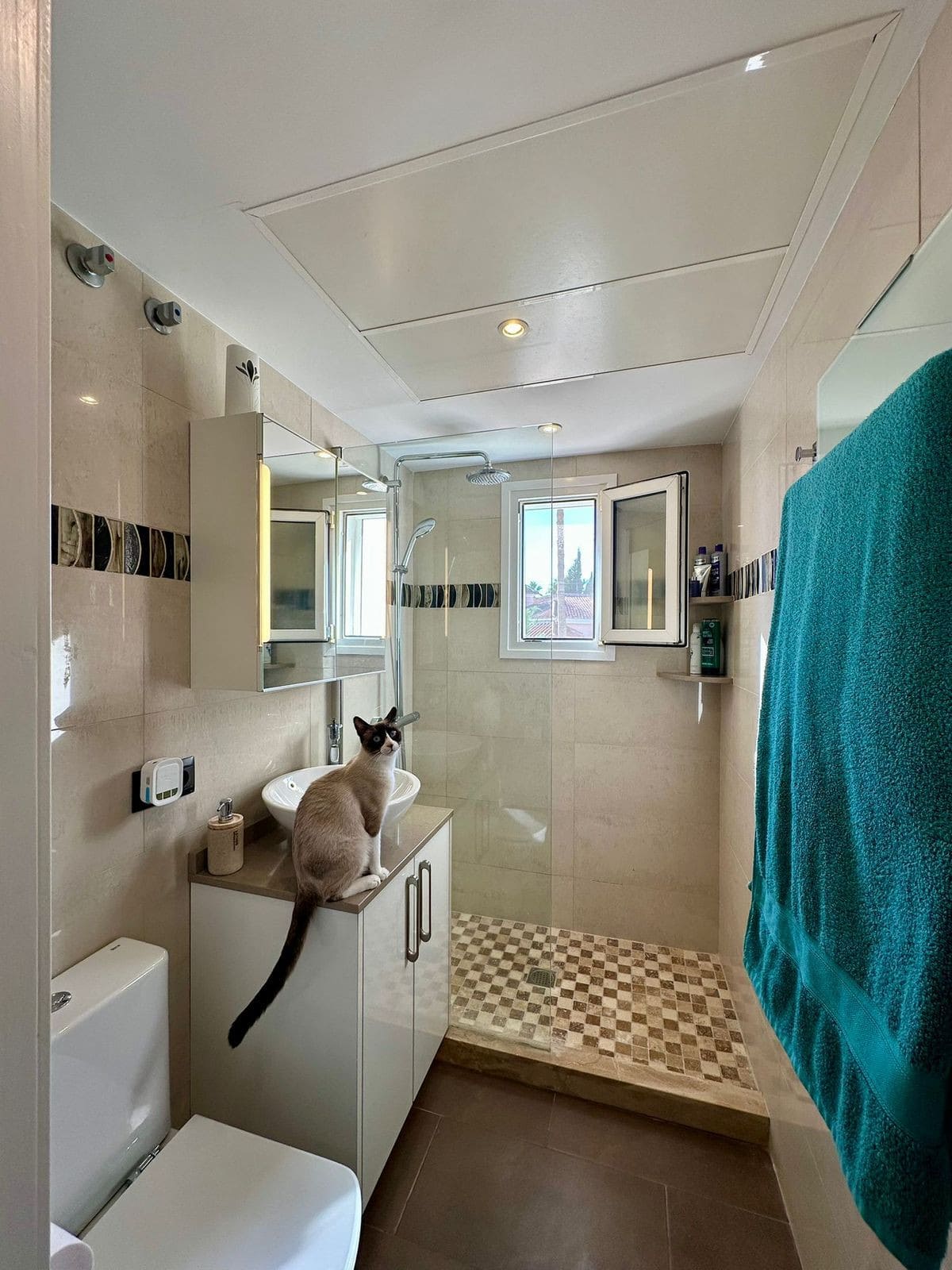 This level also includes a guest toilet, laundry room and a generous bedroom with en-suite bathroom. The upper floor offers three additional bedrooms and two bathrooms, highlighted by the impressive master suite, which features an en-suite bathroom and a large private terrace with spectacular panoramic sea views. The property is fully equipped with central heating and centralized air conditioning, electric shutters for enhanced comfort and security, and newly installed solar panels.