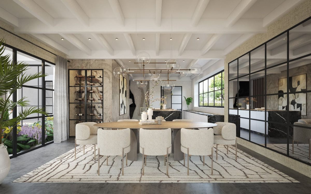 Inside, the volume carries the experience. A double-height living area framed by full-scale glazing sets the tone, light from both sides, no reliance on artificial drama. Kitchen, dining, and lounge sit open but controlled, centred around a statement island that anchors the space without dominating it. Bedroom distribution is adaptable: six are planned, eight are possible, depending on how you choose to use the lower level. All en-suite, all positioned with privacy in mind.