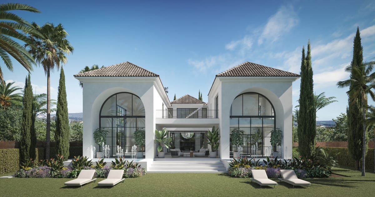 A villa project in Nueva Andalucía set on a 2,273 m² plot with 1,038 m² built, designed with 6 to 8 bedrooms, 6+2 bathrooms, a double-height central living space, and a flexible lower level ready to be defined.
