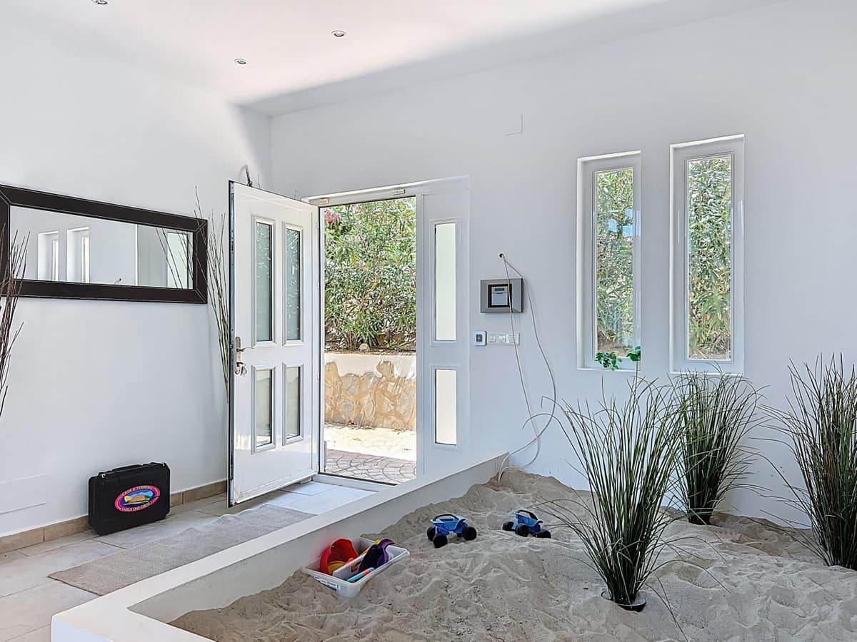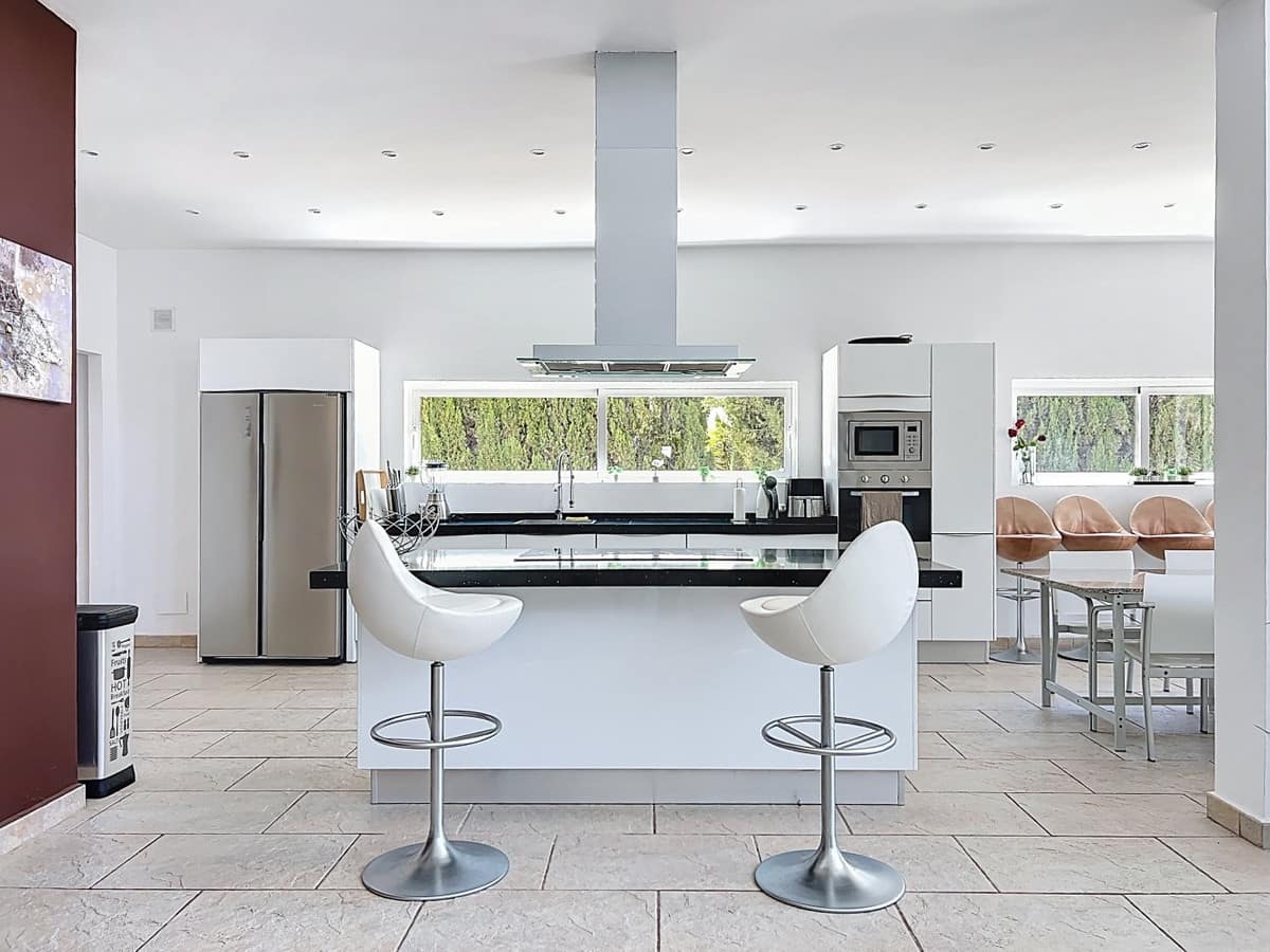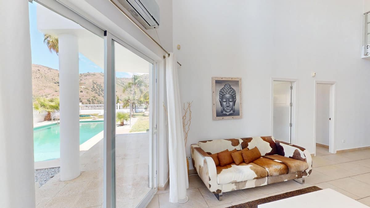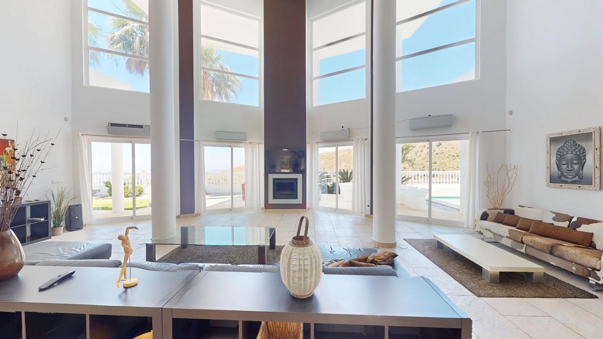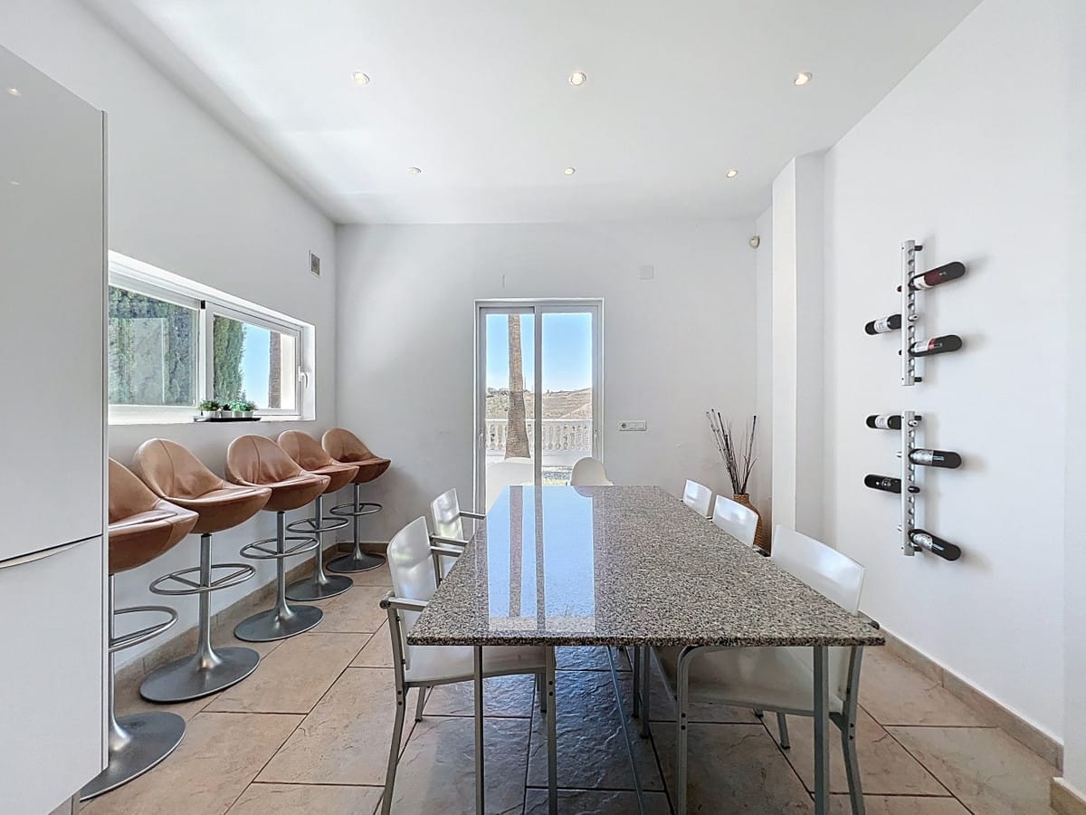 This impressive villa in Málaga, Spain, offers a harmonious blend of space, luxury, and modern design. Spanning 395.8 m2 across two floors, the property boasts 7 bedrooms and 5 bathrooms, making it ideal for large families or those who love to entertain. The ground floor, measuring 212.7 m2, features a stunning open-plan living area with soaring double-height ceilings. Floor-to-ceiling windows and sliding glass doors flood the space with natural light and provide seamless indoor-outdoor living. The living room is anchored by a sleek fireplace and complemented by comfortable, contemporary furnishings. The state-of-the-art kitchen is a chef's dream, featuring gleaming white cabinetry, high-end appliances, and a generous island with bar seating. Large windows offer picturesque views of the surrounding landscape while preparing meals. A unique feature of the ground floor is an indoor zen garden, complete with sand and decorative plants, adding a touch of tranquility to the space. The hallways are wide and well-lit, with carefully curated artwork adorning the walls. Ascending to the second floor via a modern staircase with glass balustrades, you'll find 183.0 m2 of additional living space. The primary bedroom, a spacious 26.9 m2, offers stunning views and an en-suite bathroom. The bathrooms throughout the property are sleek and modern, with large format tiles, walk-in showers, and contemporary fixtures. Some feature unique design elements like newspaper-print shower curtains, adding a playful touch to the otherwise minimalist aesthetic. Outside, the property benefits from its elevated position, offering panoramic views of the surrounding mountains and countryside, as well as the sparkling Mediterranean Sea. The outdoor area features a large swimming pool, perfect for relaxing or entertaining while enjoying the breathtaking scenery. The property offers easy access, ensuring a smooth connection to nearby amenities and attractions. Large terraces provide ample space for outdoor relaxation and entertainment, making this villa the ideal space for enjoying the Spanish climate in style. Throughout the villa, the color palette is predominantly white, creating a bright, airy atmosphere that's perfectly suited to the Spanish climate. Pops of color in furnishings and artwork add visual interest without overwhelming the serene ambiance. This villa represents the pinnacle of modern Spanish living, combining spacious interiors, high-end finishes, and breathtaking views in one impressive package a true dream home. We are pleased to be able to present this dream property to you soon, either personally or via virtual viewing. Because this world is unique – just like our Axarquía. In Andalusia. On the Costa del Sol. Here, on the sunny side of life…