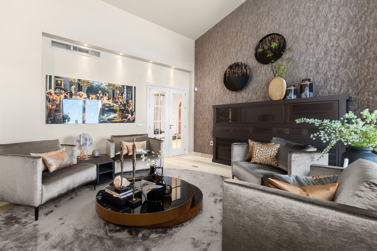 The interior of the home is equally impressive, with the main living room showcasing vaulted ceilings that create a sense of grandeur. A spacious dining area and a second living room provide ideal spaces for both formal and casual gatherings. The kitchen is equipped with high-end Gaggenau appliances, ideal for culinary enthusiasts. Stepping outside, the villa opens to an expansive terrace with a stylish lounge area, seamlessly connecting to the heated swimming pool. The south-facing orientation ensures an abundance of natural light throughout the day. This stunning villa also features a beautiful barbecue area, perfect for outdoor dining and entertaining while enjoying the spectacular views.