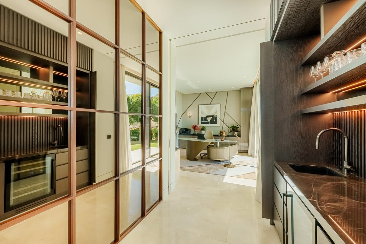At the heart of the home lies a breathtaking living area, defined by soaring ceilings and full-height glass sliding doors that seamlessly disappear into the walls, blurring the line between indoors and out. The natural light floods the space, accentuating the fine finishes and drawing the eye out to the expansive terraces, tranquil garden, and infinity pool beyond. This open-concept layout creates a fluid connection with the outdoors, offering an inviting atmosphere for both intimate moments and large-scale entertaining.
