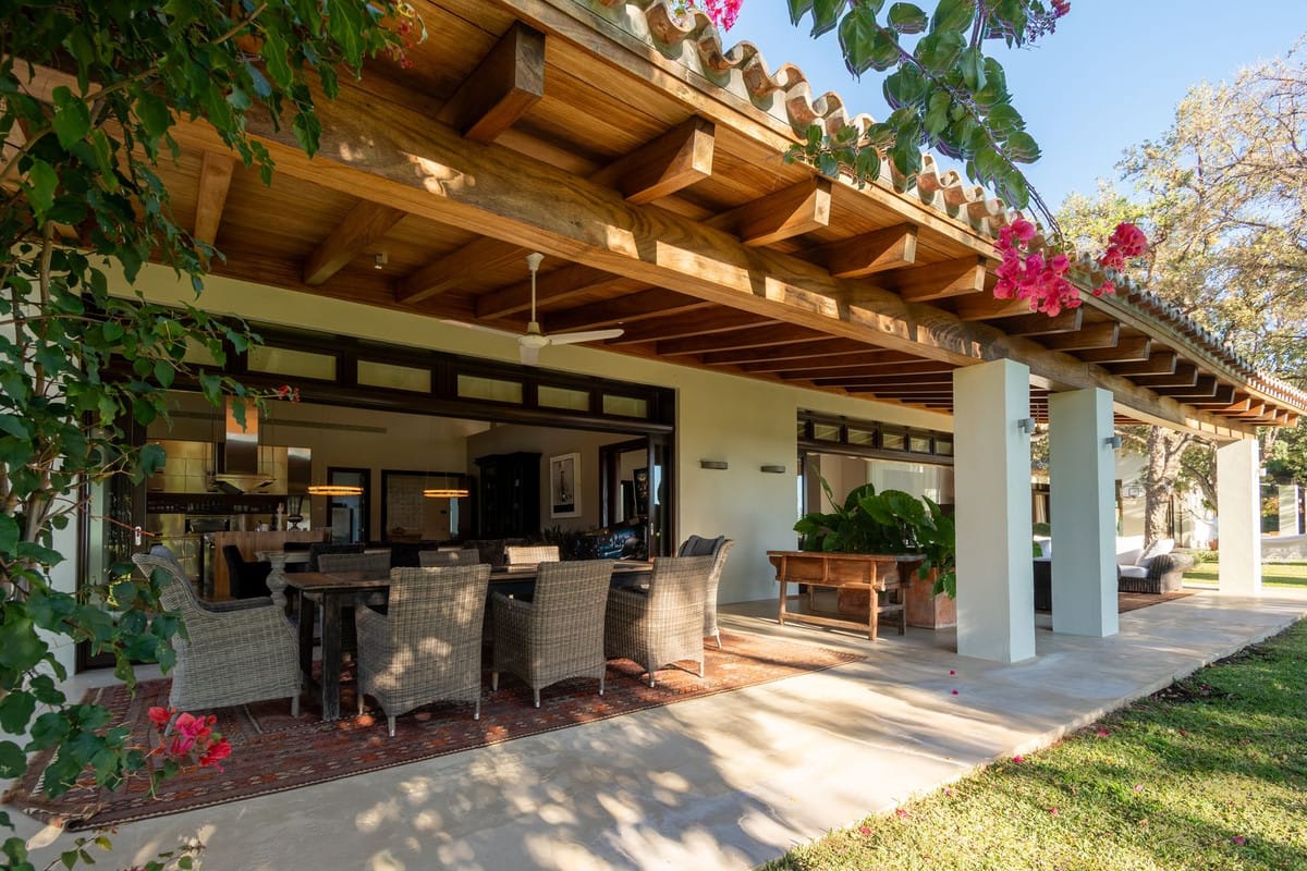 An open plan, fully equipped American kitchen and dining area with high wooden beamed ceilings and bifolding doors leading out to your private terrace for the perfect indoor/outdoor living experience that is so desired in Spain.