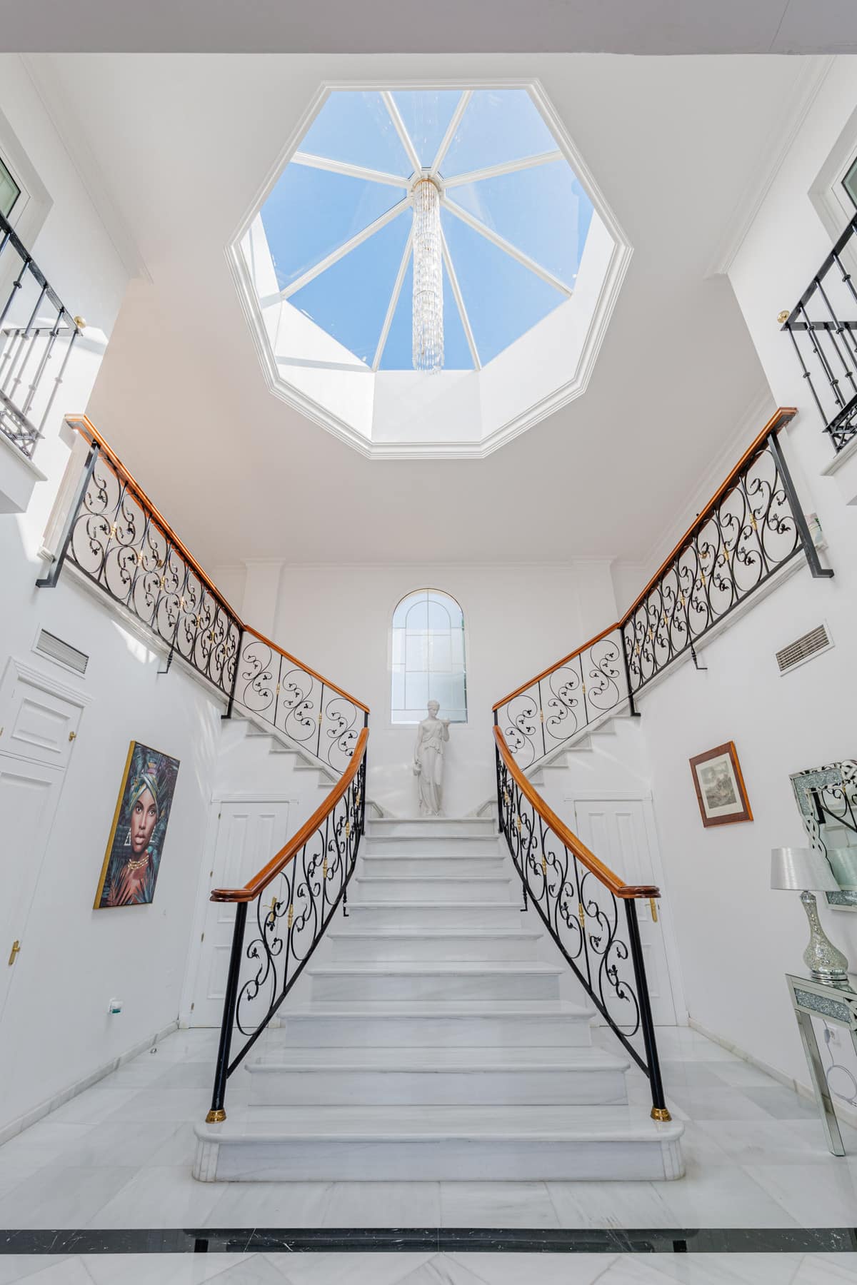 Charming Mediterranean-style villa in Puerto de la Torre, featuring spacious paved outdoor areas, meticulously maintained gardens, and elegant interiors distributed across three levels. The property welcomes you with a classic-style foyer, highlighted by an impressive double staircase made of white marble that opens out in two directions. Wrought iron railings with ornamental details and wooden handrails add a sophisticated, timeless touch. A large octagonal skylight above floods the space with natural light, further enhancing its spaciousness, while a classical sculpture on the central landing reinforces the elegance of the ensemble.