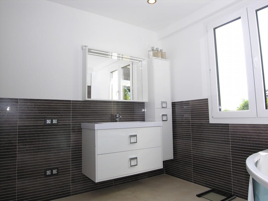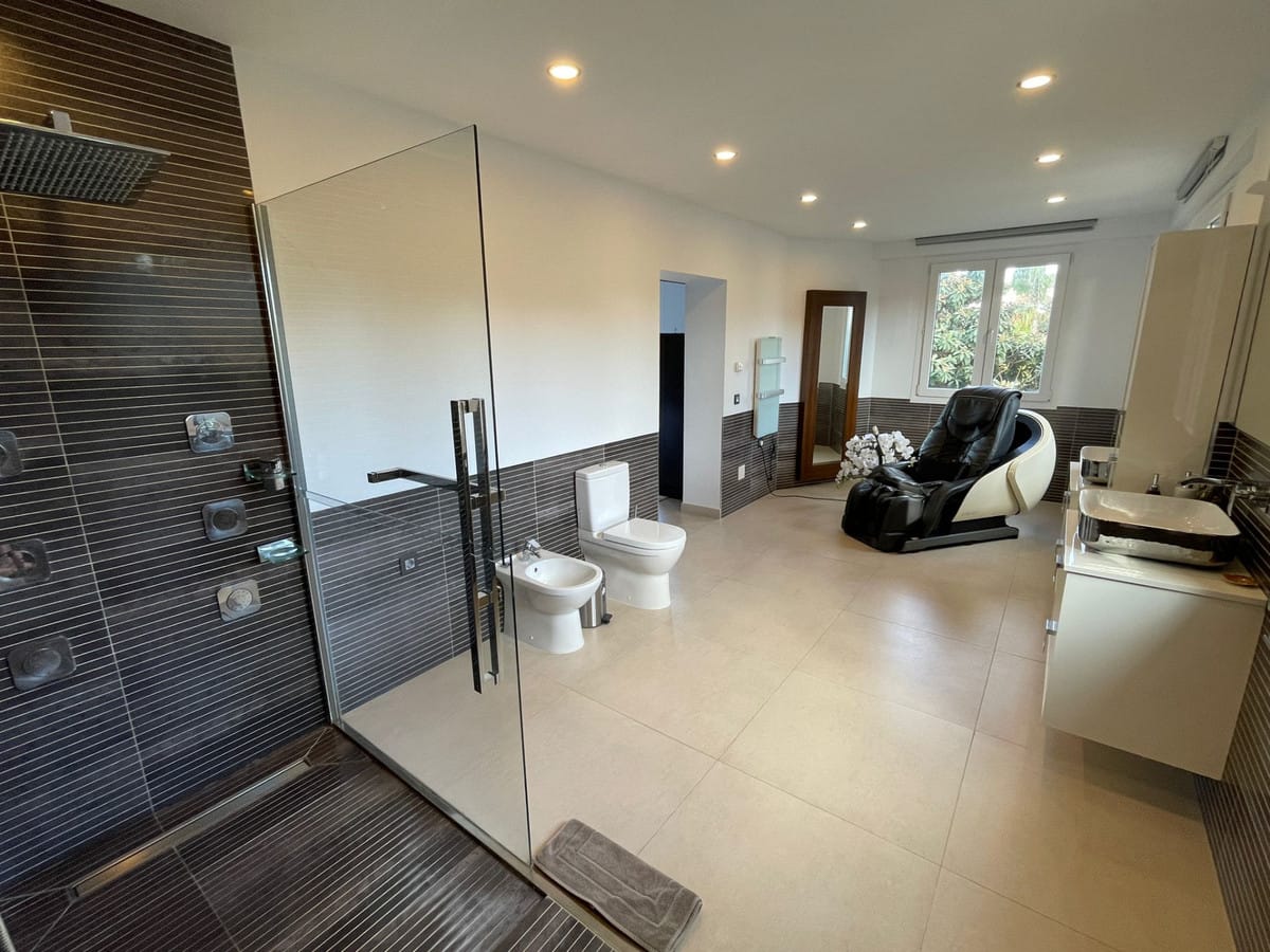 New triple glazed windows with climate glass throughout. Spacious master bedroom with Villeroy and Boch Aveo New generation Bath and China.Large south facing pool with large terraces and lawned garden .Garage for 2 cars , parking for 5 cars .Very private ,totally secure, 500 meters from the beach .