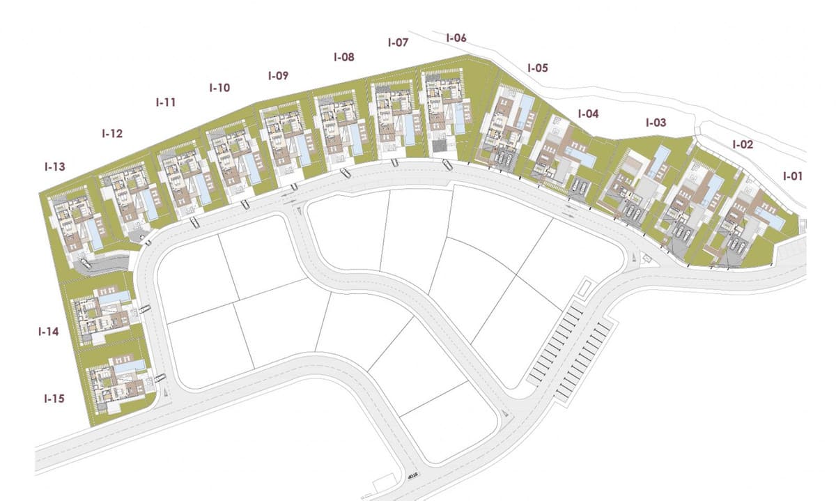 Each villa adapts individually to the natural hillside topography, creating a gated community that feels curated rather than built.